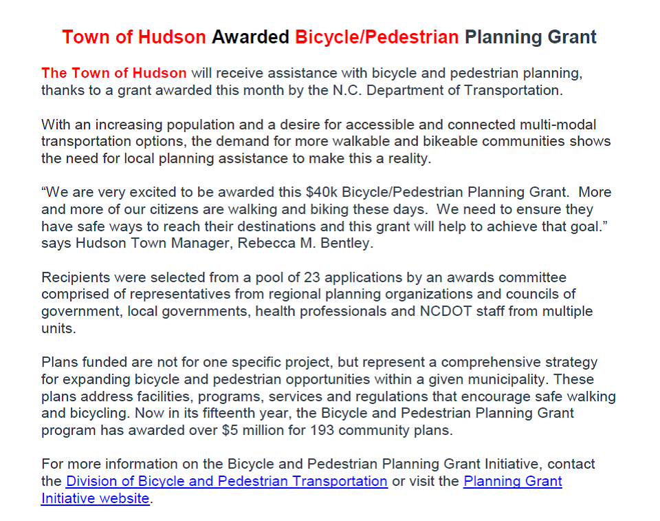 Town of Hudson awarded Bicycle/Pedestrian Grant