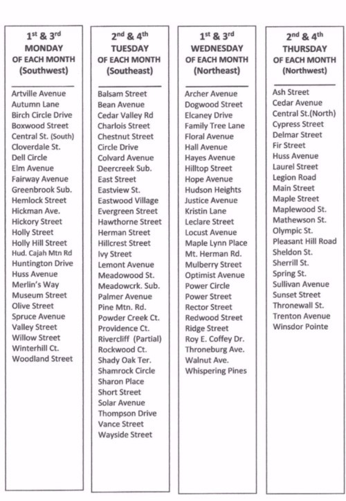 | Leaf Pick-Up | Curbside service November–January; Other months, leaves need to be collected in bags and placed at curb. |