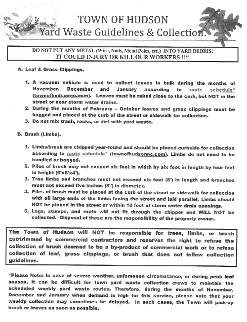 The Public Works Department provides an Annual Leaf Pick-Up for Town residents. During the fall, usually during the months of November through January, the Public Works Department picks up leaves. The Town has a vacuum system that vacuums up the leaves, and the leaves need to be raked in a pile the curb so they can be raked into the vacuum machine. The leaves need to be free of rocks, tree limbs, or other debris that could damage machinery or cause injury to the machine operator. The days of for leaf pick-up varies by street. Call the Hudson Town Hall at 728-8272 or the Hudson Town Garage at 728-2826 for more information.
